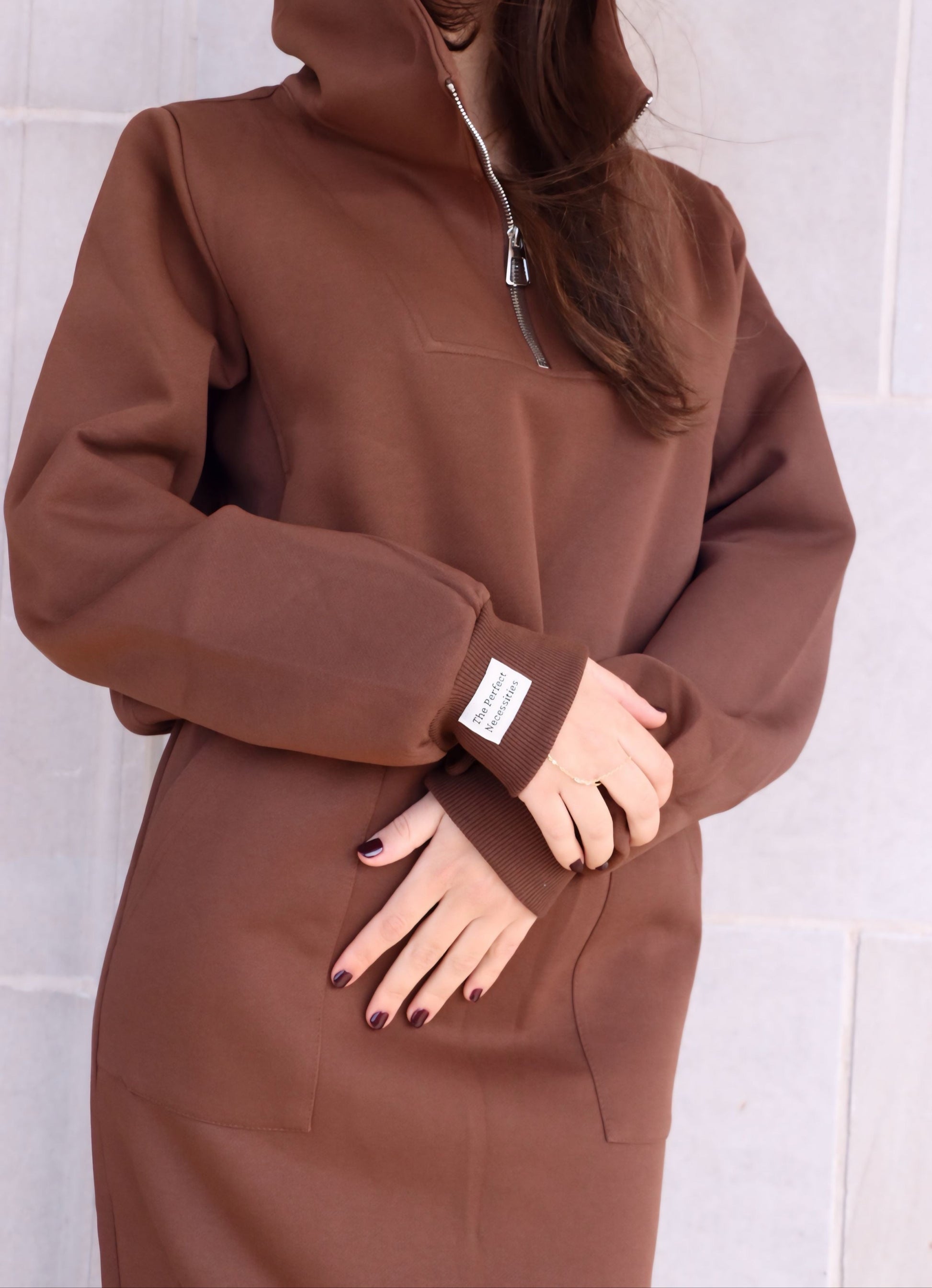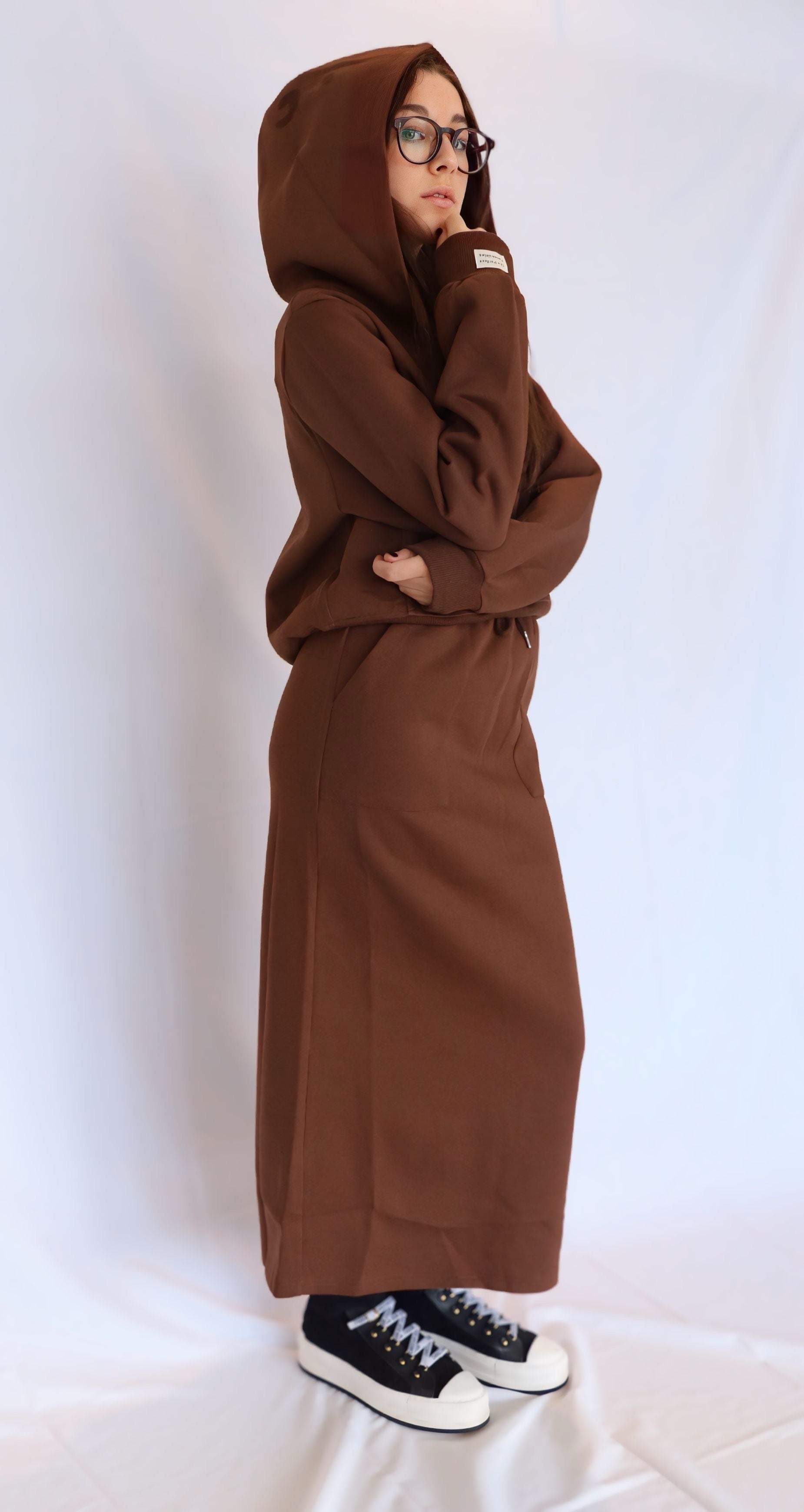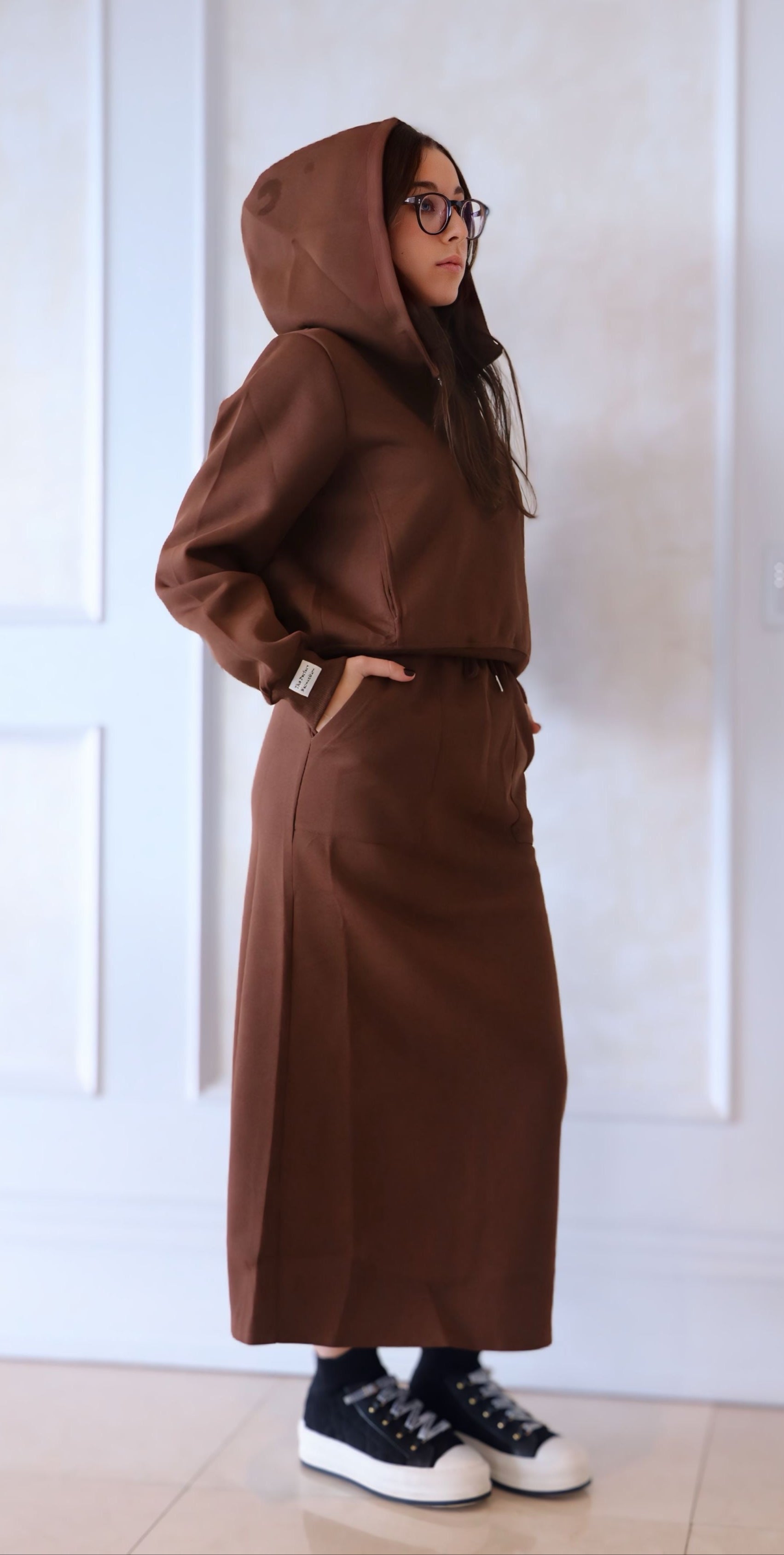 Effortlessly chic and designed for versatility, the Coco Lounge Set is perfect for the spring transition. Made from a lightweight, breathable fabric, this two-piece ensemble includes a sleek hooded sweater and a midi-length skirt with a subtle back slit for easy movement.